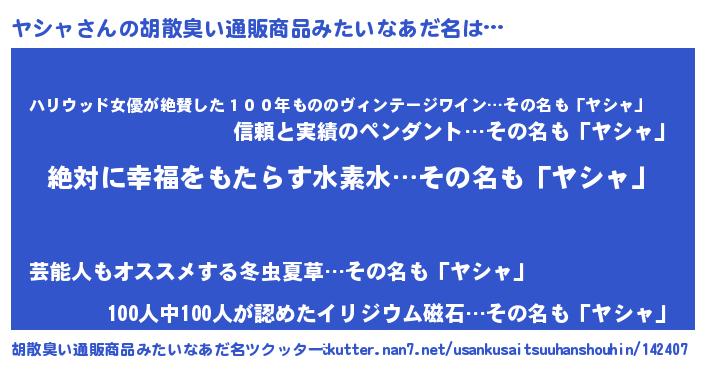 | 意味不明あだ名 | 『永久保存ヤシャ』『自称ヤシャ』 |