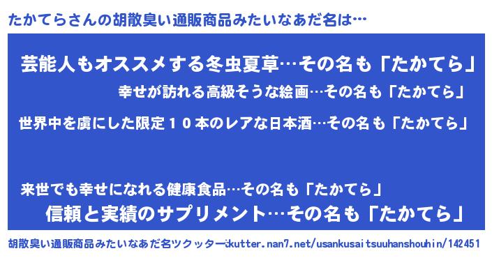 | ヒーロー風カッコイイあだ名 | 『仮面タカダー』『サイバー戦士タカテラ』 |