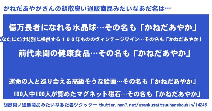 | ヘコむあだ名 | 『かねだあやか(苦笑)』『かねにゅー』 |