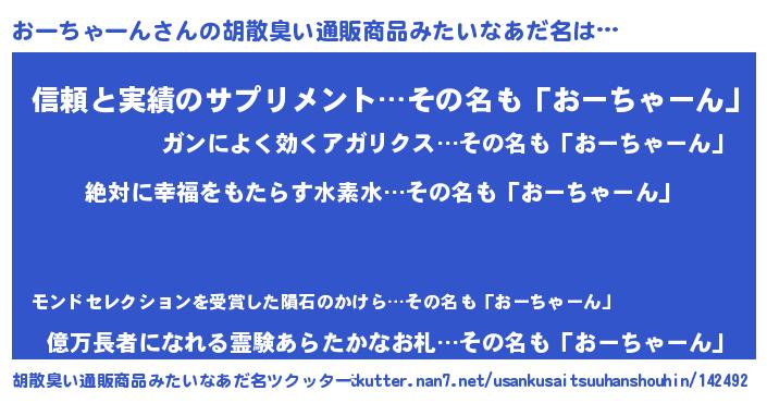 | 男性向けラノベタイトル風あだ名 | 『おーちゃーんという概念が存在しない退屈な世界 』 |