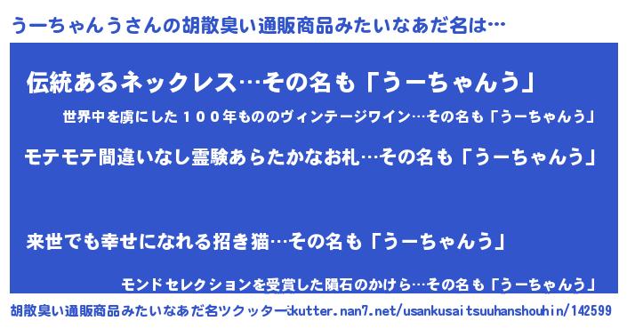 | 男性向けラノベタイトル風あだ名 | 『ウーチャンウアートオンライン』 |