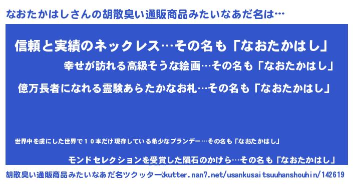 | 男性向けラノベタイトル風あだ名 | 『ナオタカハシアートオンライン』 |