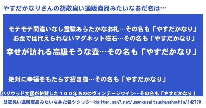 | 男性向けラノベタイトル風あだ名 | 『はたらくやすだかなりさま!』 |
