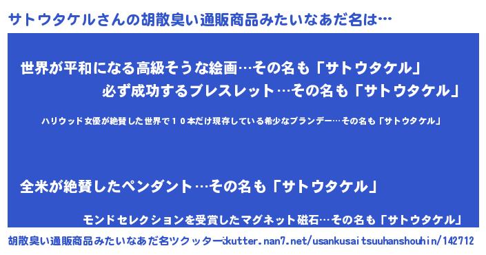 | 意味不明あだ名 | 『住所不定無職サトウタケル(85歳)』 |