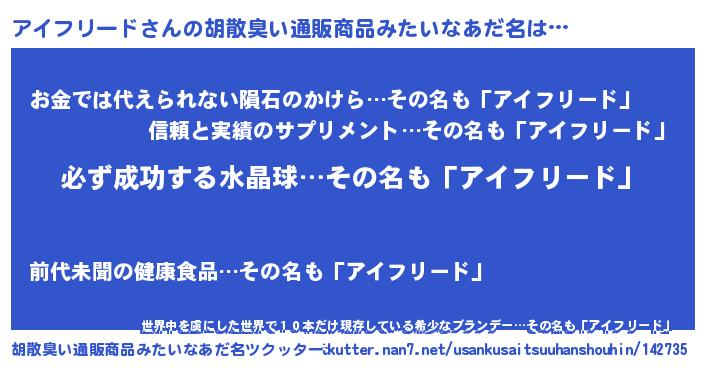 | 男性向けラノベタイトル風あだ名 | 『アイフリードスレイヤー』 |