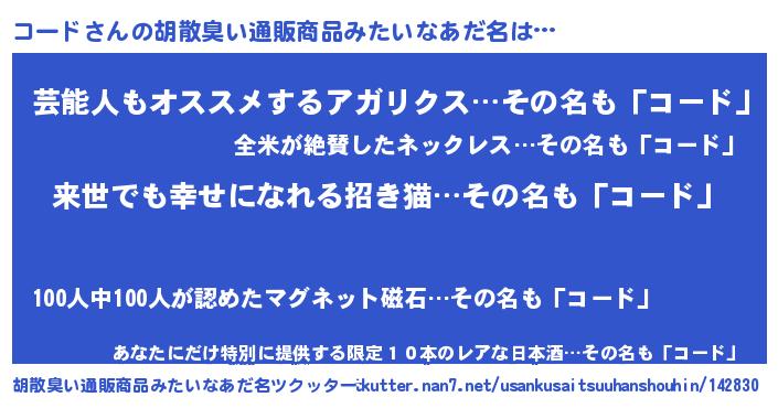 | 意味不明あだ名 | 『永久保存コード』『自称コード』 |
