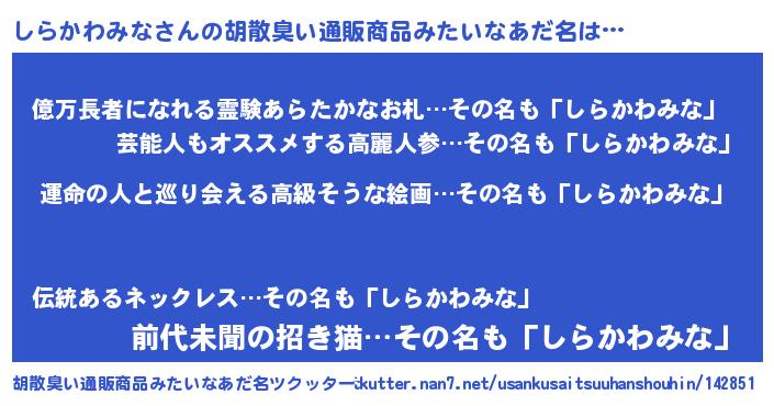 | 意味不明あだ名 | 『しらかわみなフォーエバー』 |