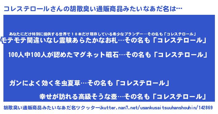 | 男性向けラノベタイトル風あだ名 | 『コレステロールスレイヤー』 |