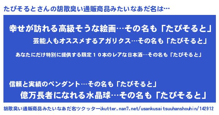 | 意味不明あだ名 | 『住所不定無職たぴそると(43歳)』 |