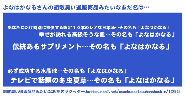| 男性向けラノベタイトル風あだ名 | 『よなはかなるの嫁は女の子じゃないと思った?』 |