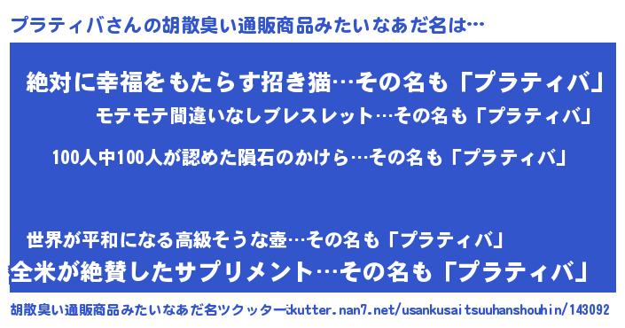 | 男性向けラノベタイトル風あだ名 | 『おまえをオタクにしてやるから、俺をプラティバにしてくれ! 』 |