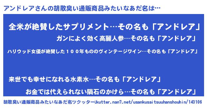 | 意味不明あだ名 | 『住所不定無職アンドレア(4歳)』 |