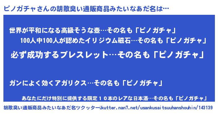 | 男性向けラノベタイトル風あだ名 | 『ピノガチャの憂鬱』 |