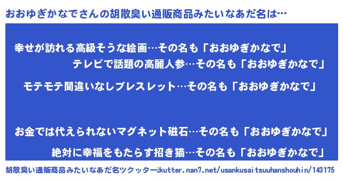 | 女子向けラノベタイトル風あだ名 | 『おおゆぎかなで姫と円卓の騎士』 |