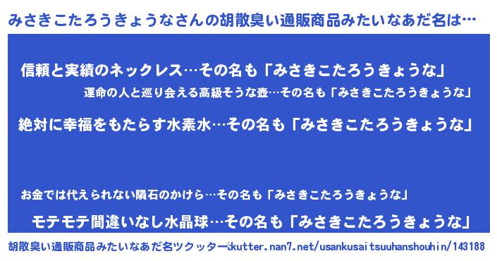 | 伝説のあだ名 | 『聞きしに勝る勇者みさきこたろうきょうな』 |