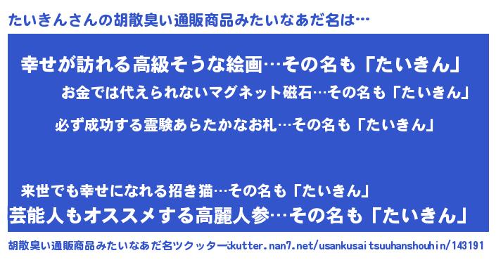 | 男性向けラノベタイトル風あだ名 | 『たいきんの憂鬱』『緋弾のタイキン』 |