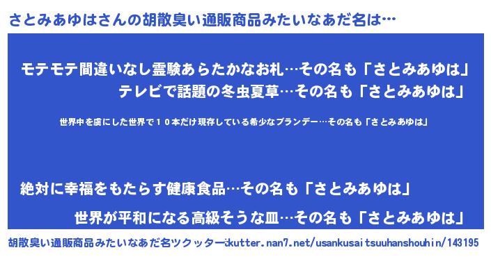 | 恥ずかしいあだ名 | 『プリティーさとみあゆは』『さとっちょ』 |