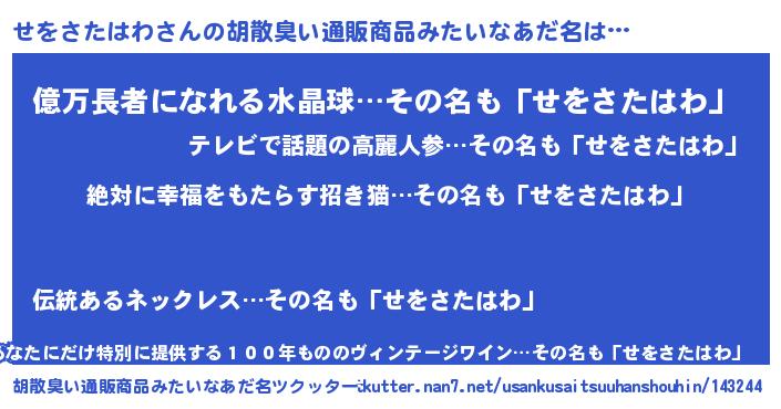 | 意味不明あだ名 | 『永久保存せをさたはわ』 |