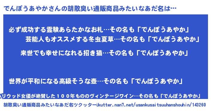 | ヘコむあだ名 | 『でんぽうあやか(笑)』『でんにー』 |