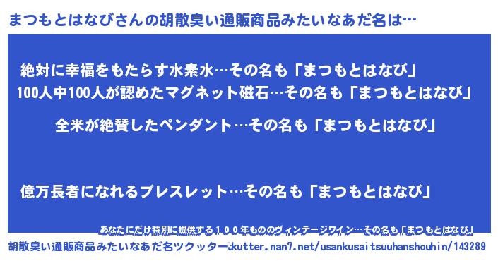 | 男性向けラノベタイトル風あだ名 | 『まつもとはなびの嫁は女の子じゃないと思った?』 |