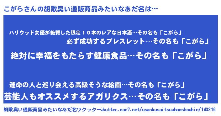 | ヘコむあだ名 | 『こがら(笑)』『こがもー』『つくし』 |