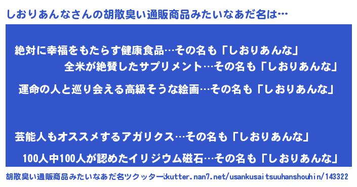 | ヘコむあだ名 | 『酢こんぶ』『しおりあんな(笑)』 |