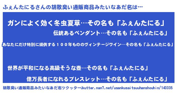 | 意味不明あだ名 | 『住所不定無職ふぇんたにる(8歳)』 |