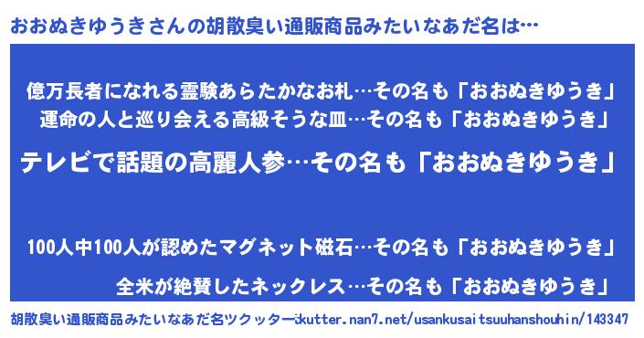 | 意味不明あだ名 | 『自称おおぬきゆうき』 |