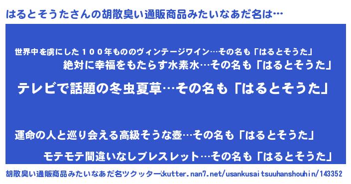 | 男性向けラノベタイトル風あだ名 | 『転生したらはるとそうただった件』 |
