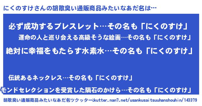 | 女子向けラノベタイトル風あだ名 | 『異世界で失敗しない100のにくのすけ』 |