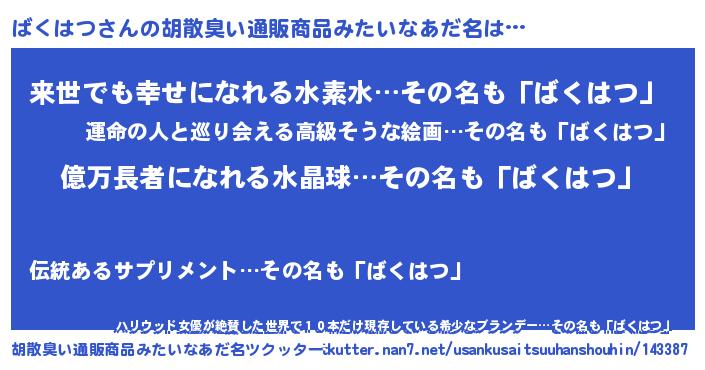 | ヘコむあだ名 | 『ばくもー』『ばくはつ(苦笑)』 |
