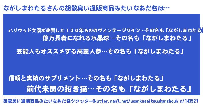 | 男性向けラノベタイトル風あだ名 | 『Re:ながしまわたるから始める異世界生活』 |