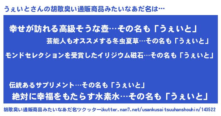 | 女子向けラノベタイトル風あだ名 | 『うぇいとの玉の輿計画!』 |