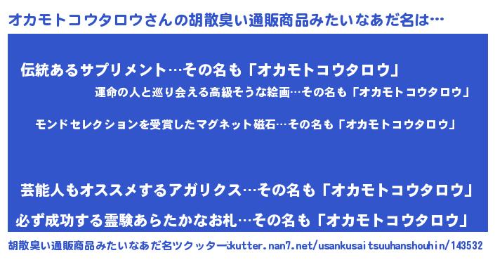 | 男性向けラノベタイトル風あだ名 | 『ノーゲーム・ノーオカモトコウタロウ』 |