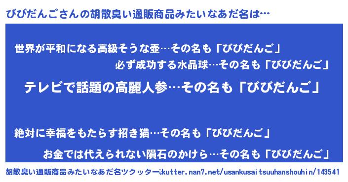 | 男性向けラノベタイトル風あだ名 | 『Re:びびだんごから始める異世界生活』 |