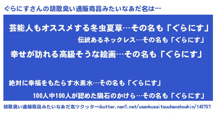| 意味不明あだ名 | 『ぐらにすフォーエバー』『自称ぐらにす』 |