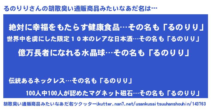 | 男性向けラノベタイトル風あだ名 | 『るのりり~年齢イコール彼女いない歴の魔法使い~』 |