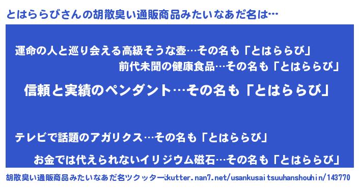| 男性向けラノベタイトル風あだ名 | 『トハララビスレイヤー』 |