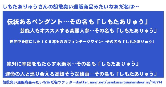 | 男性向けラノベタイトル風あだ名 | 『この素晴らしい世界にしもたありゅうを!』 |