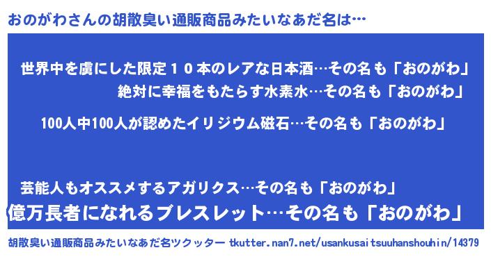 | 男性向けラノベタイトル風あだ名 | 『緋弾のオノガワ』『魔弾の王とおのがわ』 |