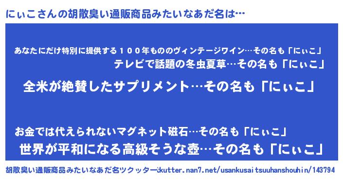 | 意味不明あだ名 | 『とにかく怪しいにぃこ』『自称にぃこ』 |
