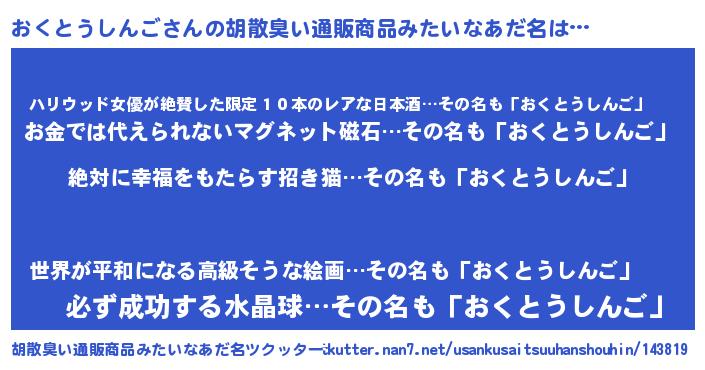 | 男性向けラノベタイトル風あだ名 | 『おくとうしんごという概念が存在しない退屈な世界 』 |