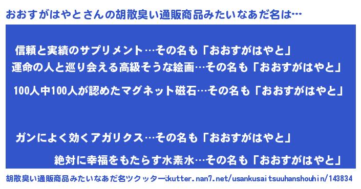 | 意味不明あだ名 | 『エリンギ科おおすがはやと属』 |
