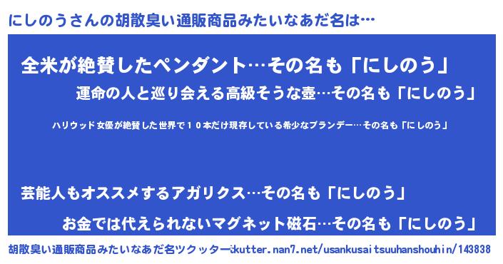 | ヘコむあだ名 | 『にしぷりん』『レバニラ』 |