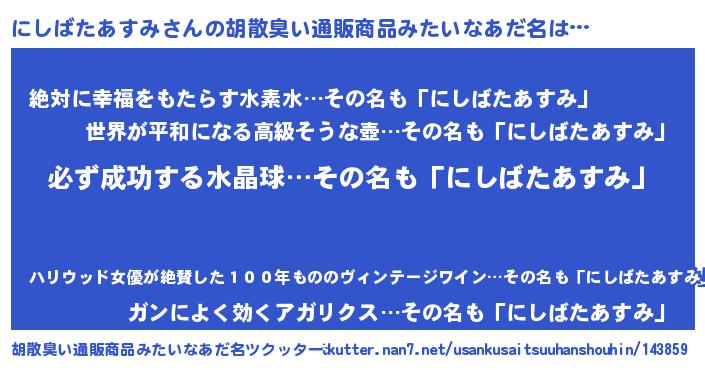 | ヘコむあだ名 | 『にしもー』『にしばたあすみ(笑)』 |