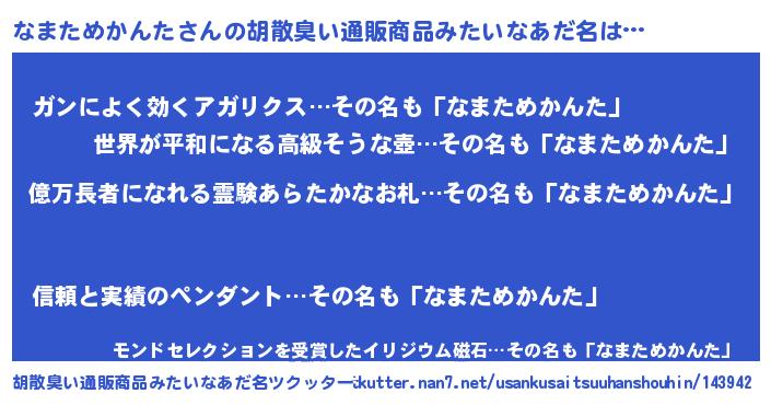 | 男性向けラノベタイトル風あだ名 | 『ナマタメカンタアートオンライン』 |