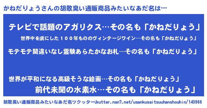 | 男性向けラノベタイトル風あだ名 | 『かねだりょうの憂鬱』 |