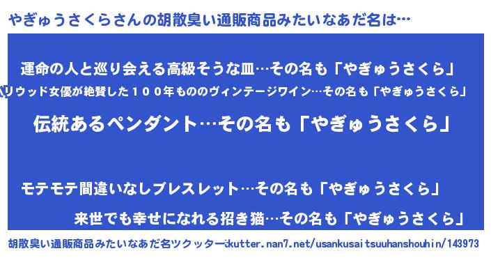 | 男性向けラノベタイトル風あだ名 | 『ダンジョンにやぎゅうさくらを求めるのは間違っているだろうか』 |