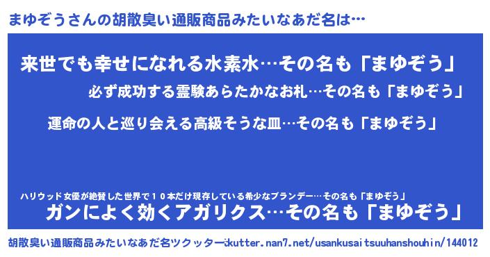 | 女子向けラノベタイトル風あだ名 | 『まゆぞうの婚約者』『闇のまゆぞう』 |