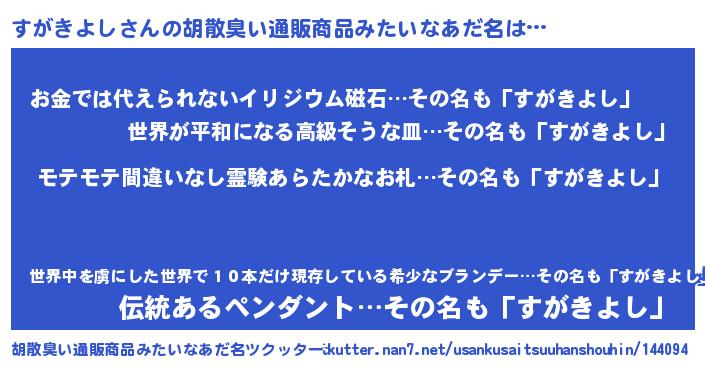| 男性向けラノベタイトル風あだ名 | 『すがきよしの憂鬱』『緋弾のスガキヨシ』 |